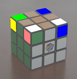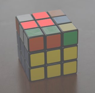 Puis finir par les sommets. Je pars du principe que tout le monde sait faire cela. Il faut évidemment veiller à ce que les centres correspondent aux tranches. Une fois cette face terminée, on retourne le cube de façon à ce que la face rouge soit en bas. On ne la touchera plus! |