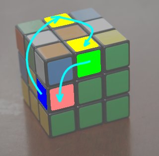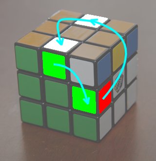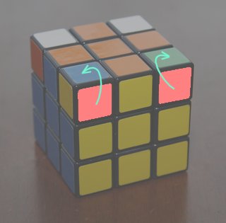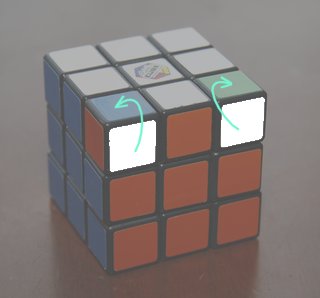 | La rotation des sommets peut nécessiter jusqu'à 3 exécution du prochain algorithme. Si 2 sommets opposés sont à tourner, aligner les sommets en tournant la face gauche ou droite d'un 1/4 de tour. | ![]() |