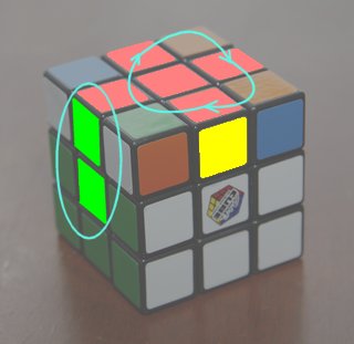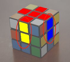 La deuxième couche est terminée, on va passer à la résolution de la dernière en commençant par les arrêtes. Ces arrêtes peuvent se présenter sous 4 configurations différentes impliquant la répétition entre 0 et 3 fois du prochain algorithme. Lors de la manipulation des arrêtes, on ignore les sommets. |