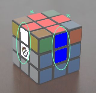 Tourner le Haut (H) jusqu'à ce que 2 arrêtes correspondent comme indiqué. Si les 2 autres (x) sont aussi justes, alors on peut passer directement aux sommets. Si uniquement 2 arrêtes opposées sont bonnes, exécuter l'algorithme suivant une fois et reprendre au début de ce paragraphe. l'astuce: ENSUITE, tourner H un coup anti-horaire (1/4 de tour) et chercher l'arrête correspondant au centre. Il ne doit en avoir qu'une... |